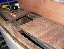 I made a mistake when I fitted the planks for the aft deck. The angle of the side decks is not the same on both sides, so I ended up with a very skewed piece of wood in the middle. Fortunately, I was able to correct it so much that it's hardly visible. It was actually a very stupid mistake given the many years of experience I have with shipbuilding. I know that practically no boats are 100% symmetrical, something I learned that the hard way many years ago. But actually looks quite nice, I am a little anxious to see if I can make the colors of the different pieces of wood match properly when I stain them.. The next project is the replacement of a 1.8 m side deck on both sides as well as a 1 meter long patch at the bottom of the port side deck, right at the rounding up to the foredeck. I've already made the patch on the starboard side. June 17, 2008: I will have to extend the repair half a meter on the starboard side, and in addition to that, it is necessary to repair the two stringers underneath the side deck.