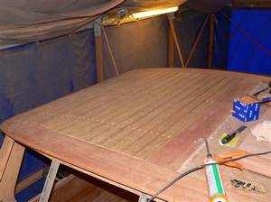 30. august 2009: Denne uge er gået med at få lagt masonitpladerne på og få tilpasset lugekarmen. Masonitten har jeg limet med epoxy i alle kanter, og med Tec7 på alle mahognistavene. Desuden er der klammet med rustfri klammer. Meningen er, at masonitten skal være helt vandtæt, så selv om der skulle blive en utæthed i fugerne imellem irokostavene, vil taget stadig være tæt, og både masonit og iroko skulle kunne holde til det. Også lugen bliver lavet så den delvist ligger oven på masonitten. Den skal ligne lugen på fordækket, altså med halvrunde karme for og agter. Jeg har karmen næsten færdig nu, jeg mangler blot at høvle de havrunde ender. Her i weekenden fik jeg også monteret den forreste planke - noget værre bøvl, men det lykkedes da at få den spændt på plads. Jeg har limet den med epoxy, så den skal nok blive i faconen når tvingerne kommer af. Så nu mangler jeg blot at slibe, så er kanterne færdige.