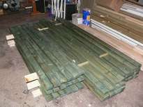 Her er nogle billeder af træet til det nye skelet. Som nævnt er det 40 cm lavere end det gamle, og så er det en smule kraftigere. I stedet for at køre lægterne igennem rundsaven, har jeg fræset enderne ned med overfræseren, så det kun er det stykke der går ind i krydset som er tyndere. Desuden har jeg sat et stykke plade på, så de passer bedre ind i de firkantede rør.