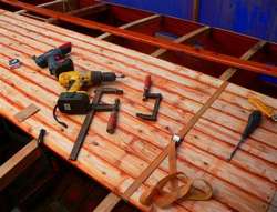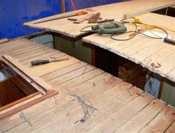 Så er turen kommet til ruffet, og jeg har besluttet mig for at give det en grundig renovering. Forkanten skal jo som planlagt have de runde hjørner igen, og da ruftaget er sunket ca. 1,5 cm der hvor masten står og alligevel skal renskrabes nedenunder, har jeg bestemt mig for at skifte hele taget ud - eller næsten, for det der går ind under forkanten af styrehuset kan jeg ikke sådan lige udskifte. Jeg har nu afmonteret det meste af forkant, sider og skandæk på den forreste meter, og der skal skiftes en smule nedenunder. Jeg er nødt til at skifte den yderste teakstav i begge sider for at få dækket til at passe rundt om de nye hjørner. Taget afmonterer jeg som det næste, det er planen at skare det over den agterste bjælke lige foran styrehuset. Brædderne er 72 x 16 mm fyr som er bejdset en smule for at ligne mahogni, og jeg laver det nye tag i samme materiale. Dog har jeg tænkt mig at lægge 4 mm krydsfiner ovenpå og slutte af med et lag glasfiber. Ruffet kan godt trænge til en forstærkning. De 2 hele bjælker i kahytten skal have lamineret ca. 1,5 cm ovenpå for at komme til at passe.