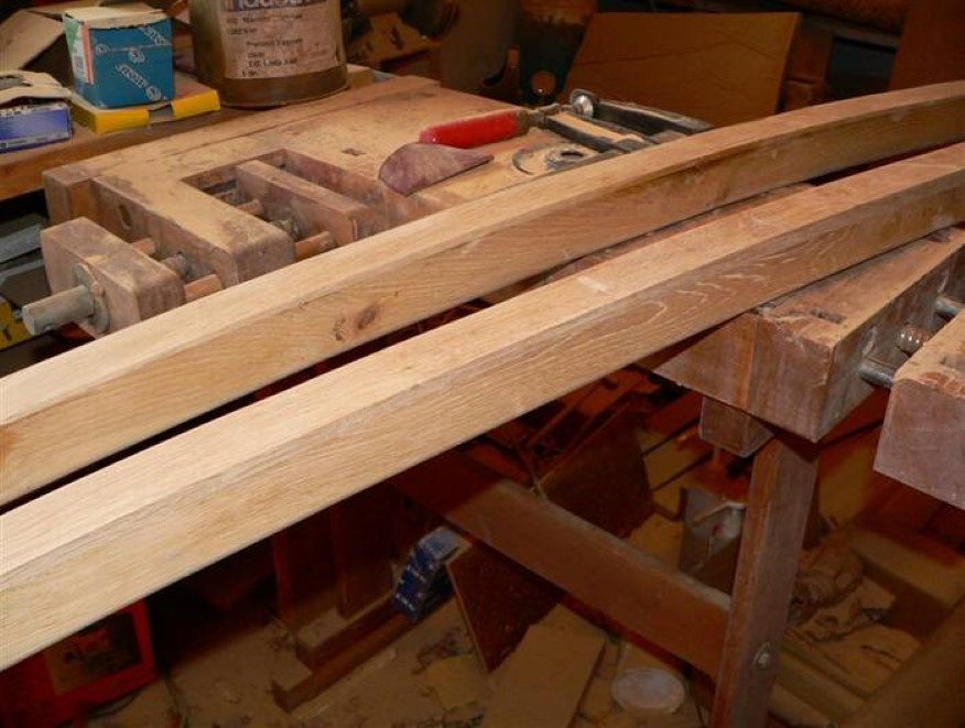 lister ovenpå, lagde bjælkene på plads i båden og mærkede dem af ved at slibe nogle punkter ned efter en retteskinne lagt hen over skotterne. Derefter var det nemt at mærke kurven op med en trækstok. Jeg har også fået lavet det indvendige færdig der hvor forkant og sider skal skrues fast. Jeg har lavet det i Keruing, det er nemt at arbejde med, holdbart og desuden billigt. Lige nu er jeg i gang med at tilpasse sider og forkant, hvilket jeg regner med at have monteret i løbet af næste uge.