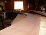Så er turen kommet til den sidste etape af træarbejdet på overbygningen. Det er meningen at taget skal laves som en sandwich med 12 mm mahogni-stave nederst, 3,2 mm oliehærdet masonit i midten og 10 mm iroko-stave øverst. Kantene skal være 155 mm mahogni-planker, og bredde-forskellen udlignes med en mahogni-fisk i midten. Den brede planke i agterenden har jeg limet sammen i den rigtige runding af 3 stk 8,5 x 205 mm planker - jeg fik en tømrer til at skære og høvle dem, for de dimmentioner kan jeg ikke klare selv med det værktøj jeg har til rådeighed. Det er nødvendigt at planken har den rigtige runding, for der er ikke noget at trække den over - den skal holde selv. Jeg limede de tynde brædder sammen i den samme skabelon, som jeg brugte til bjælkerne, så resultatet blev en krum planke på 26 x 205 mm. Efterfølgende mærkede jeg rundingen op på begge sider, og så var det bare at klø på med overfræseren. resultatet kan du se herunder.