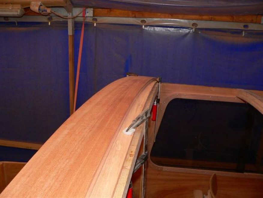 30. august 2009: Denne uge er gået med at få lagt masonitpladerne på og få tilpasset lugekarmen. Masonitten har jeg limet med epoxy i alle kanter, og med Tec7 på alle mahognistavene. Desuden er der klammet med rustfri klammer. Meningen er, at masonitten skal være helt vandtæt, så selv om der skulle blive en utæthed i fugerne imellem irokostavene, vil taget stadig være tæt, og både masonit og iroko skulle kunne holde til det. Også lugen bliver lavet så den delvist ligger oven på masonitten. Den skal ligne lugen på fordækket, altså med halvrunde karme for og agter. Jeg har karmen næsten færdig nu, jeg mangler blot at høvle de havrunde ender. Her i weekenden fik jeg også monteret den forreste planke - noget værre bøvl, men det lykkedes da at få den spændt på plads. Jeg har limet den med epoxy, så den skal nok blive i faconen når tvingerne kommer af. Så nu mangler jeg blot at slibe, så er kanterne færdige.