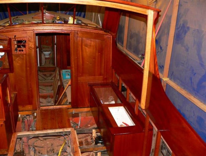 27. februar 2010: Jeg er nu godt i gang med at lakere løsdelene, og har bl. a. fået shinet rattet gevaldigt op. Én ting er sikkert, og det er at det ville blive et meget dyrt rat hvis man skulle betale timeløn for at få det lavet. Jeg tror at der er brugt mindst 30 timer på at rense og slibe - helt hen i vejret, når man kan købe et nyt knagerat for en tusse. Men dette rat hører jo til båden, så derfor skal det bare være sådan - jeg synes nu også at det er blevet ret pænt med kransen i mahogni og egre i ask. Jeg har sænket skruerne og proppet hullerne med lysere mahogni, jeg synes at det er pænere end synlige messingskruer. Oliebehandlingen af løsdelene er stort set overstået, og jeg er i fuld gang med at lakere. Der er ganske mange emner at lakere, så det kommer nok til at tage et par uger.