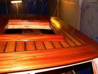 February 27, 2010: I am now well on my way to varnishing the loose parts, and have, among other things given the steering wheel a much-needed overhaul. One thing is for sure, it would be a very expensive steering wheel if I had to pay hourly wages to have it done. I think it has taken at least 30 hours to clean and sand it - a bit crazy when you can buy a new steering wheel for DKK 1000. But this steering wheel belongs to the boat, so, therefore, it just has to be like this - I now also think that it has become quite nice with the mahogany wreath and ash spokes. I have countersunk the screws and plugged the holes with lighter mahogany, I think it looks nicer than the visible brass screws.