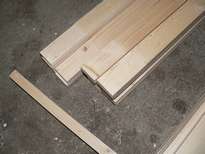 Her er nogle billeder af træet til det nye skelet. Som nævnt er det 40 cm lavere end det gamle, og så er det en smule kraftigere. I stedet for at køre lægterne igennem rundsaven, har jeg fræset enderne ned med overfræseren, så det kun er det stykke der går ind i krydset som er tyndere. Desuden har jeg sat et stykke plade på, så de passer bedre ind i de firkantede rør.