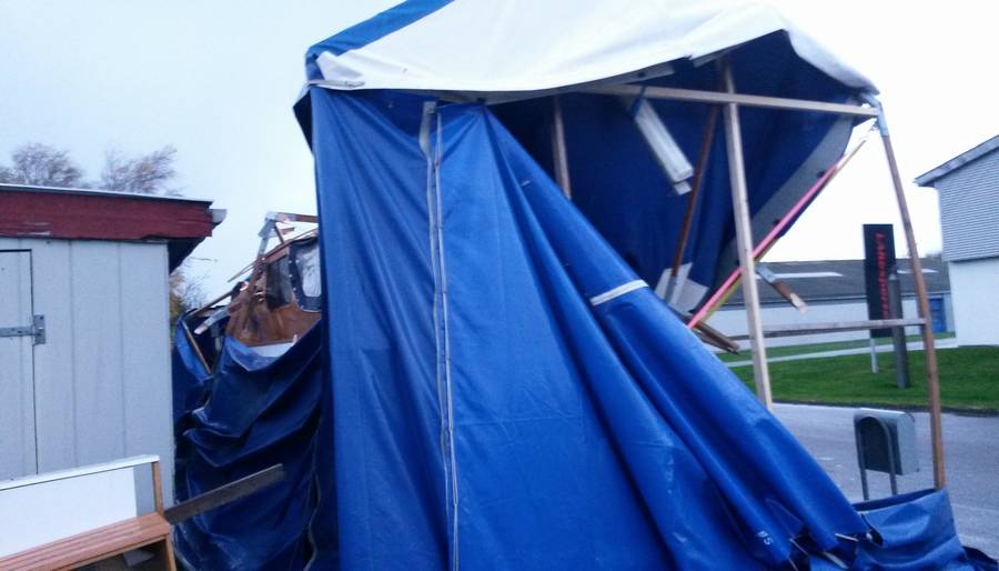 Jeg slap desværre ikke - mit bådtelt er blæst omkuld i stormen. Jeg havde mine bange anelser da jeg så vejrudsigten, og de begyndte at snakke om atmosfæriske bomber og orkan. Men jeg håbede på at vindretningen ville holde sig i syd - sydvest, for så er teltet nemlig i læ. Men sådan gik det ikke. Til at starte med så det ellers lovende ud, det blæste kraftigt fra sydvest med vilde vindstød, men teltet holdt fint, og lige efter kl. 14 så det ud til at begynde at løje af. Så jeg troede at jeg havde klaret skærene, men så lidt før kl. 15 gik det helt amok, og denne gang fra stik vest. Der var rigtig megen rusk i teltet og det svajede kraftigt, men det betyder normalt ikke noget, og de første 15 min. holdt det fint. Men lige pludseligt kunne jeg se at ét af de midterste spær knækkede, og så var