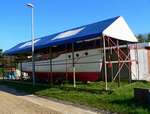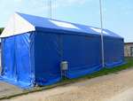 Det er nogle år siden jeg sidst har haft teltet oppe, og en del af fundamentet er i mellemtiden gået til. Så jeg måtte lave noget nyt. Desuden har jeg, efter at teltet blæste omkuld under stormen Allan i 2013, gjort det 40 cm. lavere, derfor skulle elastikkerne nederst på siden flyttes. Det var nu ikke så galt, og selv topdugen var nem at lægge på - det var nemlig vindstille den dag.